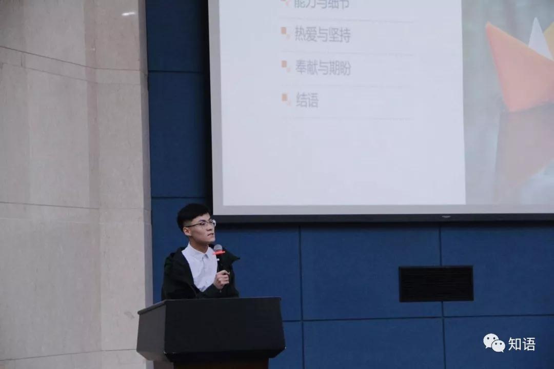 接着,英语1702班薛焱智为同学们进行了“学生干部的奉献意识”培训。他从学生干部的作用和态度、能力和细节、热爱与坚持、奉献与期盼五个方面为同学们进行讲解。他以自己的援疆支教经历为例,向大家说明:只有通过不懈努力与坚持,积极培养责任意识,不忘初心地奉献自己的能量,才能成为一个出色的学生干部。