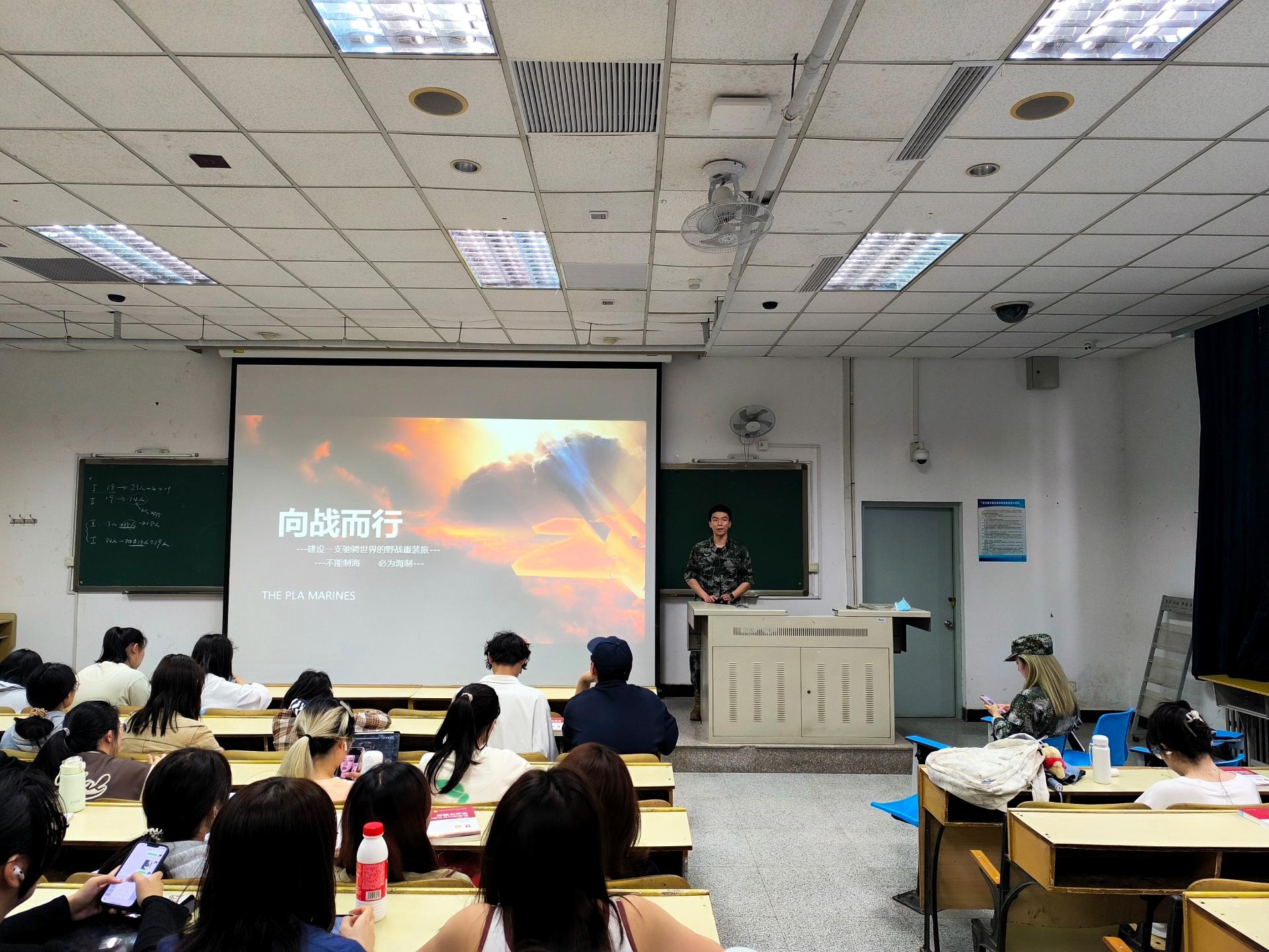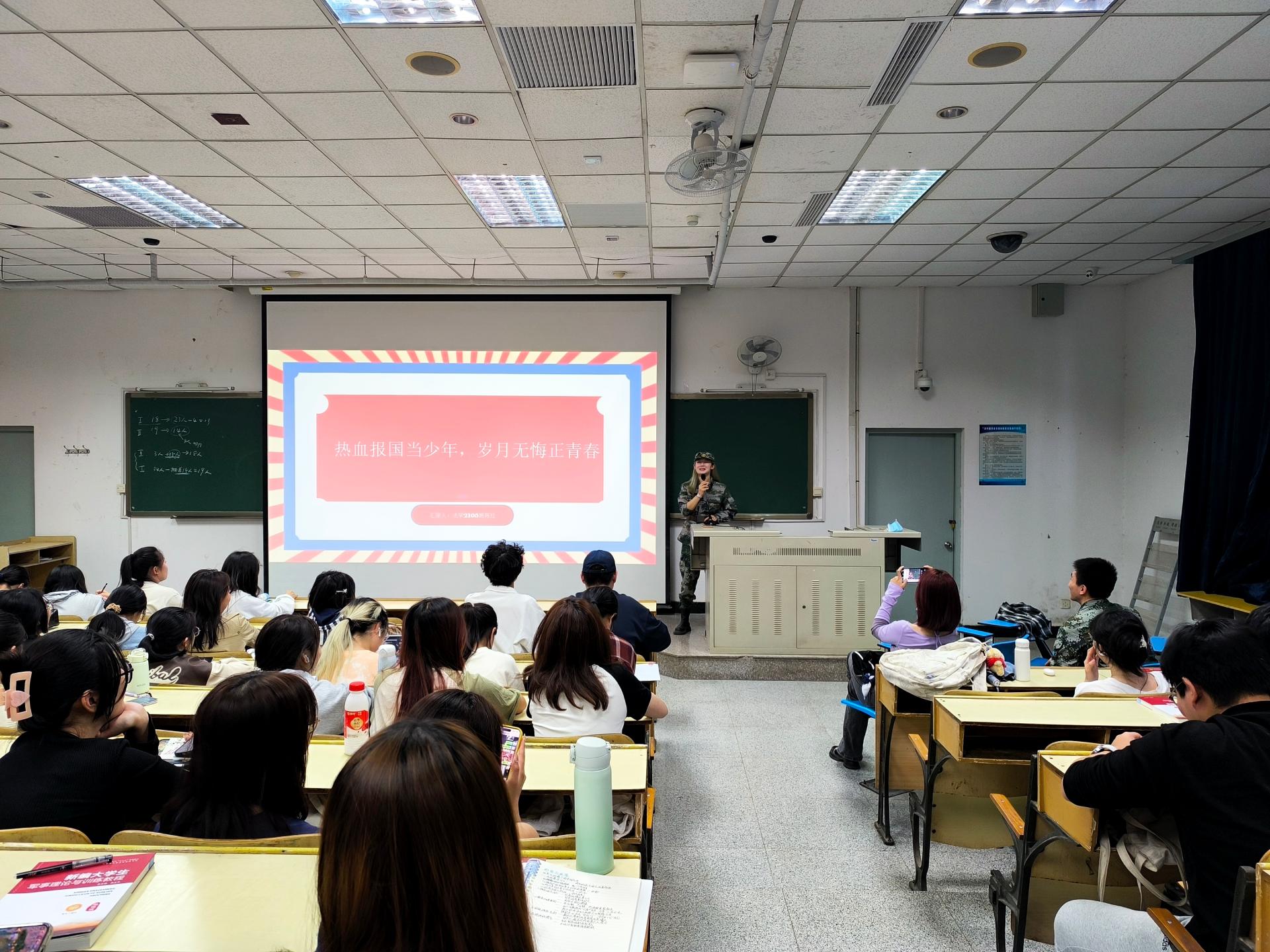陈红主要以女兵的视角,用诙谐幽默的话语为同学们详细介绍了入伍流程、军旅生活、入伍的感受及意义。她讲到,军旅生活与想象中的不同,只有自己亲身经历才会感受到中国军人的使命担当。两年的军旅生活使她练就了一副过硬的体魄,结识了一批感情深厚的战友,也为自己创造出一段难忘的回忆。退役复学后,她依旧保持良好的习惯,坚持体能训练,提高身体素质。