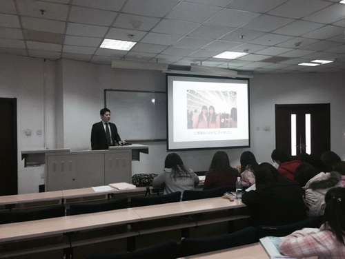 随后,大峰有次郎室长在 FIUA-407 教室举行了 2015 年度日本平安女学院大学编入生招生说明会,围绕日本平安女学院大学的历史、特色、教学环境、留学生生活和奖学金等事项进行了详细说明,并耐心回答了同学们的提问。与会同学纷纷表示,此次说明会明确了日本留学的相关知识,对留学规划有很大帮助。