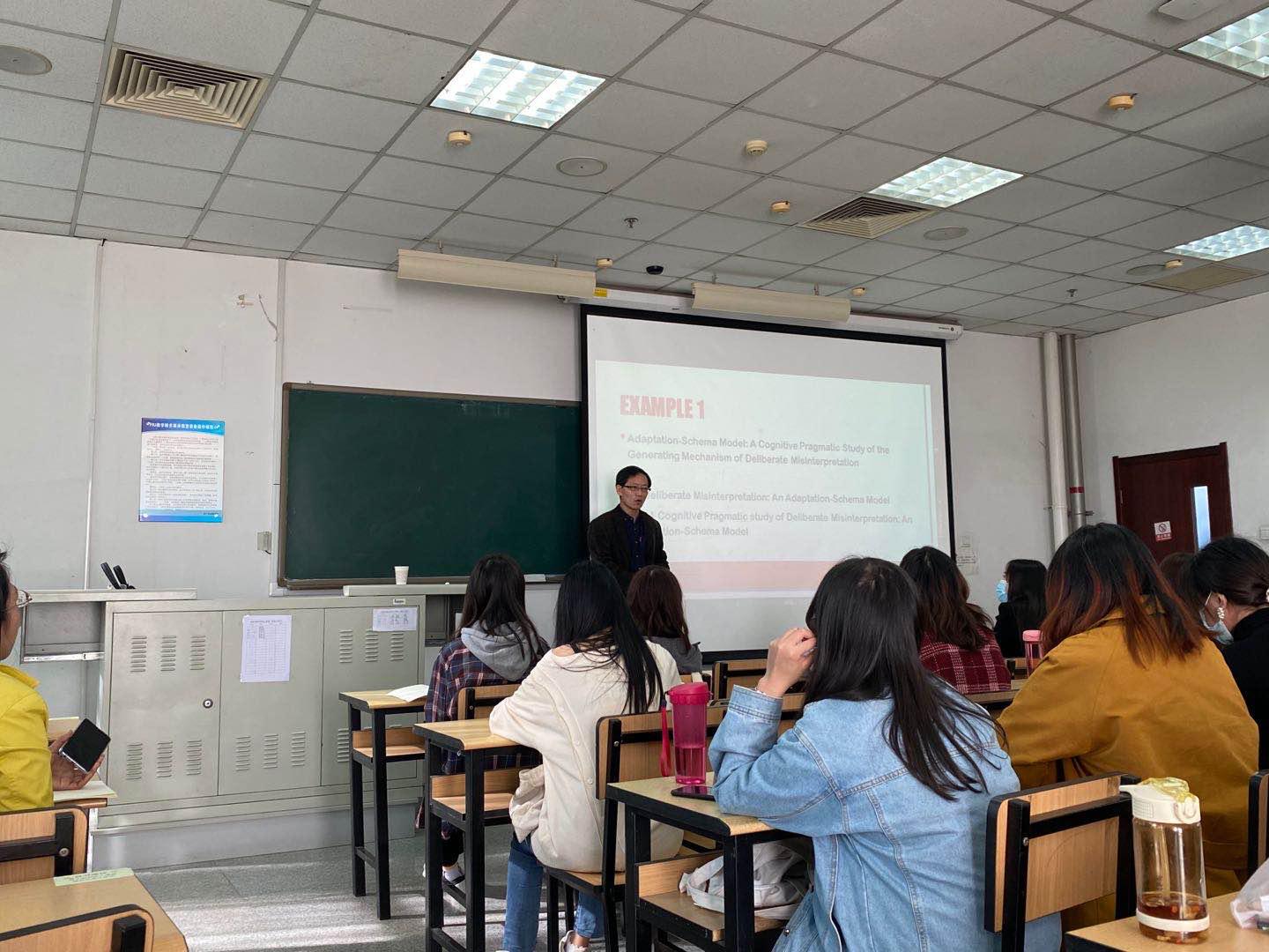 院长王占斌教授,以及全体外国语言学及应用语言学研究生和MTI研究生参加了此次讲座。项成东教授先是向同学们介绍了学术论文的八个要素,然后围绕论文写作中的基本要求—创新进行了详细的讲解。
